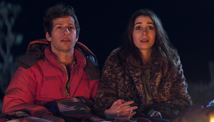 Sin lugar a dudas que la superficie de Palm Springs es ideal para que Samberg y compañía desplieguen su artillería, pero lo que ocurre es algo distinto, y es en este punto donde resulta crucial correrse de las expectativas (al menos en mi caso) para que todo funcione como corresponde. La película ensaya una variación del humor característico de The Lonely Island, en un acto que puede leerse como una simple exploración, o también como una maduración por parte de los comediantes. Lo que solía ser acelerado y desmedido, aparece acá en una forma más mesurada, ajustada a la tristeza que recorre el fondo del relato. Es como si el Nyles de Samberg fuera una versión biológicamente más adulta de otros de sus personajes, pero que sigue aferrado a un modo de vida (y de humor) que las personas a su alrededor ya no comparten. Y eso lo deja solo, a la deriva, contando chistes para un público que ya no está ahí. El descubrimiento de la adultez de los demás, y la constatación de la propia soledad, son lo que dan lugar a la tristeza de la que hablamos. Y que solo puede corregirse por medio de la adaptación, de la aceptación, y claro, del amor. Como sucedió con Adam Sandler en La mejor de mis bodas, Andy Samberg se anima su primera comedia romántica propiamente dicha, sin huir de los tópicos habituales del género.